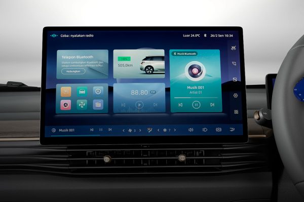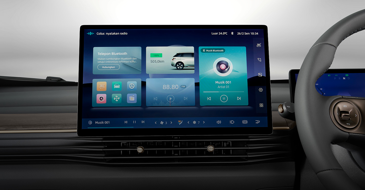 Elegan menjadi tampilan utama pada interior mobil listrik Cloud EV ini. Menghadirkan nuansa black pearl yang berkelas pada setiap detail interior kabin. Pada bagian head unit menjadi fitur yang menonjol berkat ukuran 15, 6 inci dan MID berukuran 8,8 inci, sehingga memudahkan pengemudi melihat informasi lebih jelas di layar.